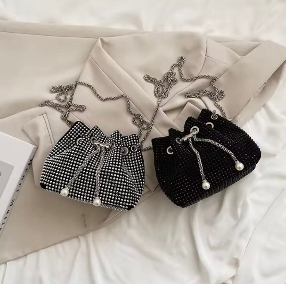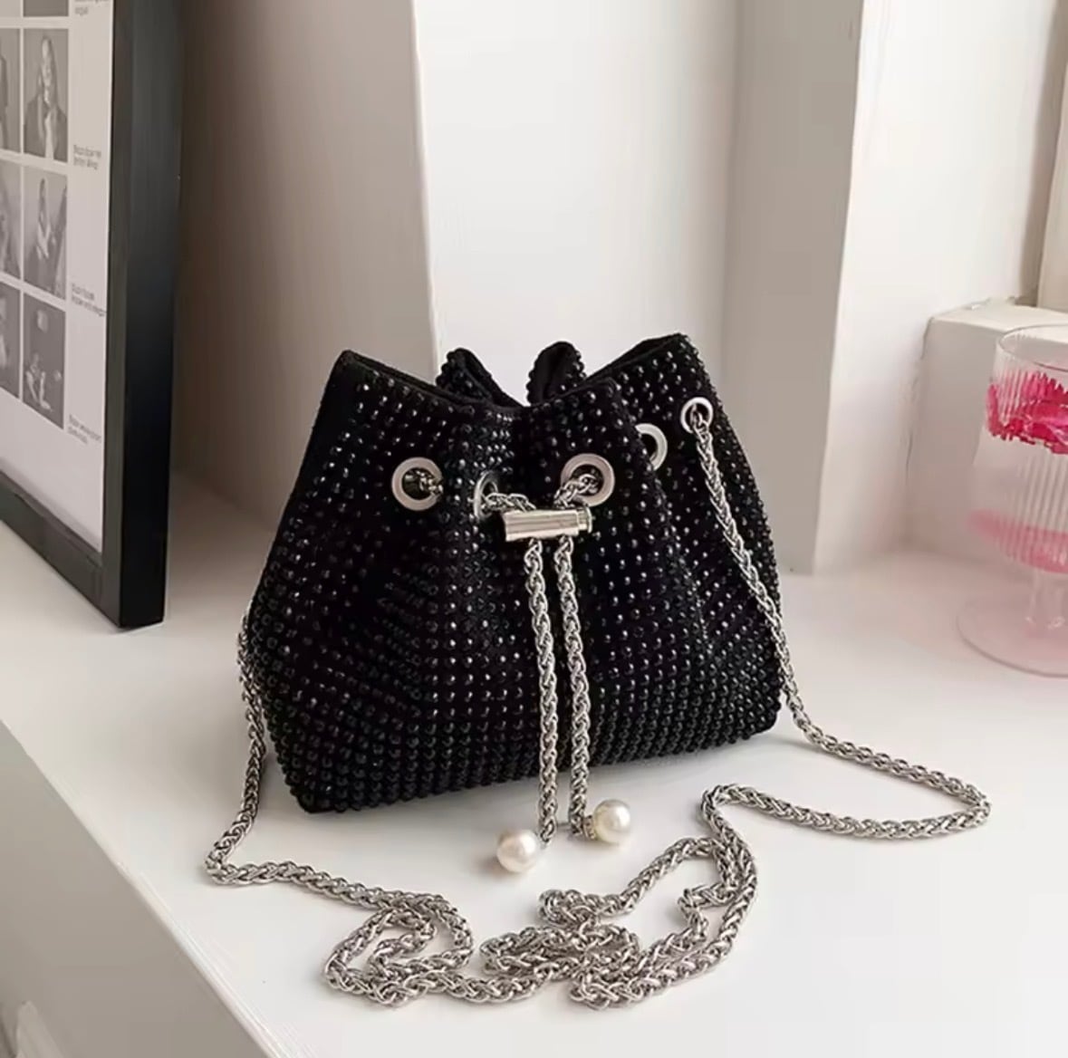 スパンコールが輝くチェーンバッグ。